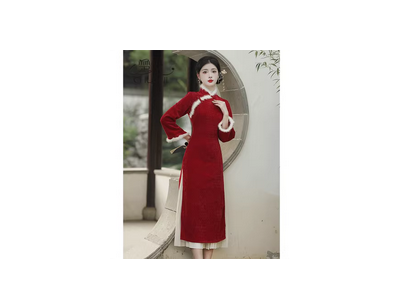 熙世界新中式改良旗袍红色连衣裙女秋冬国风礼服长裙 复古海棠 M