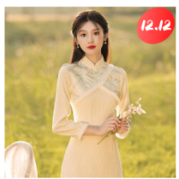 戚薇改良旗袍2023年冬季新款加厚长袖中国风复古年轻款少女素雅连衣裙 米黄花边