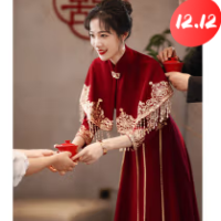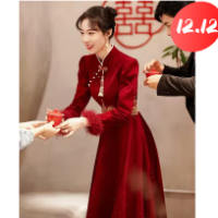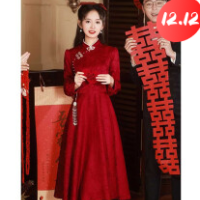 麦斯贝思(MAISIBEISI)旗袍敬酒服新娘冬天加厚酒红色长袖中式结婚晚礼服女平