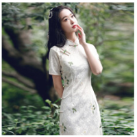 恒源祥刺绣旗袍裙连衣裙2022年夏季新款改良版修身裙子连衣裙复古中国风 象牙白