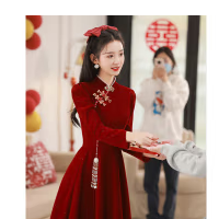 丽佰昕旗袍敬酒服新娘2023新款酒红色订婚礼服中式结婚长袖丝绒加厚冬季 酒红色