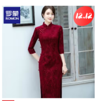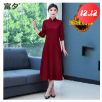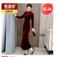 恒源祥【轻奢高档】金丝绒旗袍连衣裙秋冬新款礼服长款妈I妈装 酒红