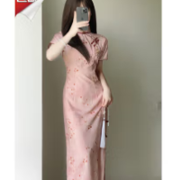 罗蒙(ROMON)改良旗袍2023年夏季新款粉色茶服年轻款少女中国风长款夏季连